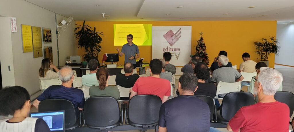 Uma reunião geral com servidores da Editora UFV (EDT) e da Divisão Gráfica Universitária (DGU) apresentou um amplo panorama de objetivos e metas referentes ao ano atual, bem como aqueles traçados para 2026. Na ocasião, aproximadamente trinta pessoas acompanharam a exposição desenvolvida pelo diretor, o professor Brício dos Santos Reis, que demonstrou detalhes do que vem sendo planejado e executado.